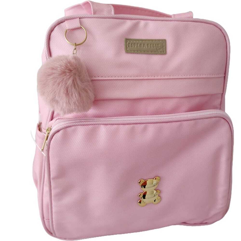 Feita para acompanhar os momentos mais fofos, esta mochila rosa é um item indispensável. Seu design delicado se destaca pelos detalhes em dourado, como os zíperes e os charmosos apliques de ursinho. O pom-pom de pelúcia, que pode ser removido, dá um toque divertido e suave ao acessório. Além de linda, a mochila é super funcional, com um bolso frontal e bolsos nas laterais que ajuda a manter tudo organizado e fácil de encontrar. Feita em material emborrachado, com alça de ambro e de mão.